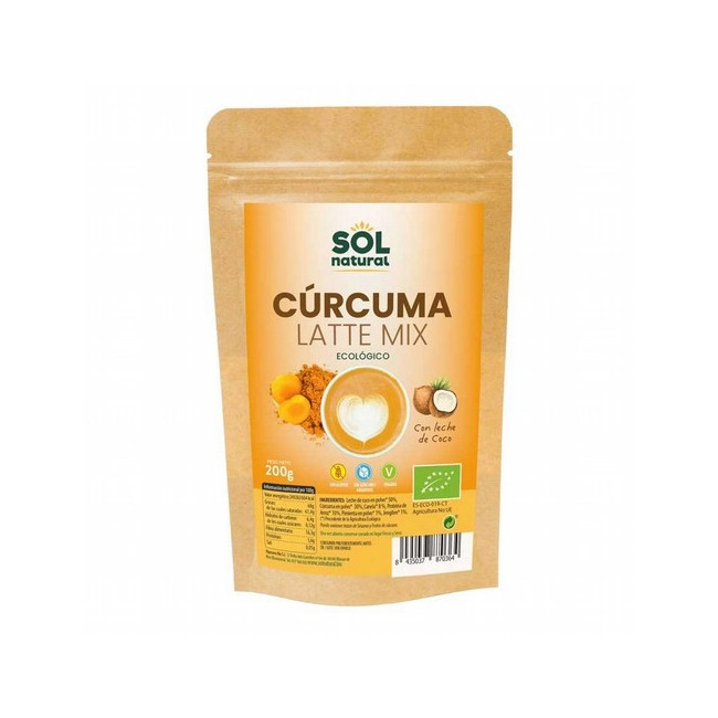 CURCUMA LATTE MIX BIO 200G SOL NATURAL Preparado de cúrcuma en polvo con leche de coco, para la preparación del novedoso Curcuma Latte. Una bebida muy de moda sobre todo entre quienes llevan una dieta alternativa y saludable. La cúrcuma posee propiedades antiinflamatorias, antioxidantes y anticancerígenas. Además favorece el sistema inmunológico.