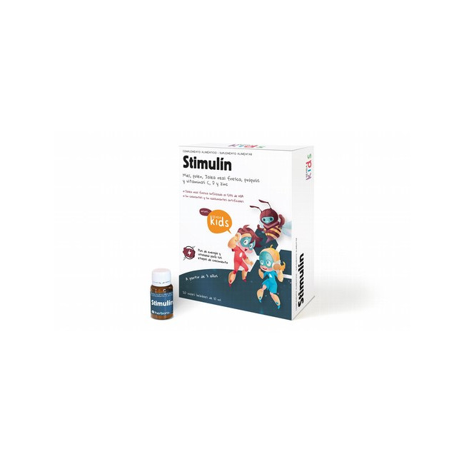 Complemento alimenticio en formato de viales bebibles, sin azúcares añadidos, especialmente formulado para niños y niñas. Contiene principalmente jalea real fresca liofilizada, con un mínimo de 5,4% de HDA, lo que garantiza su calidad y pureza. Además, incluye ingredientes específicos que cubren las necesidades nutricionales de los más pequeños, como miel, polen, própolis, vitamina C, vitamina D y zinc. Ingredientes Por vial: miel milflores 1200 mg, ES polen 500 mg, Jalea real fresca (proveniente de jalea real fresca liofilizada) 400 mg (133,34 mg), Propolis 20 mg, Vitamina C 80 mg (100% VRN), Vitamina D 5 mcg (100% VRN), Zinc (gluconato) 10 mg (100% VRN) VRN: Valor de Referencia de Nutrientes