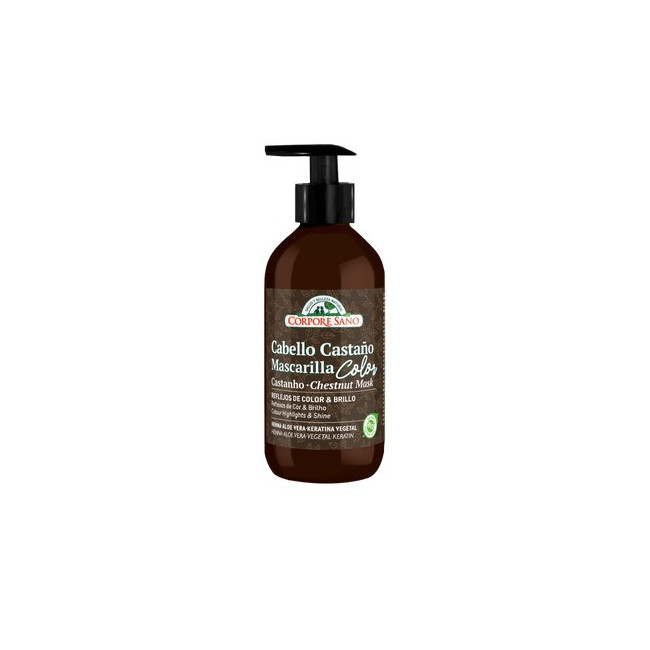 Mascarilla Color Cabello Castaño HENNA, ALOE VERA, ACEITE DE JOJOBA, GIRASOL, KERATINA VEGETAL Mascarilla capilar que reaviva el color castaño natural o teñido del cabello. Su fórmula con Henna, Aloe Vera, Aceite de Jojoba y Extracto de Girasol hidrata, nutre y aporta reflejos cálidos y luminosos, manteniendo la fuerza y el brillo del cabello.
