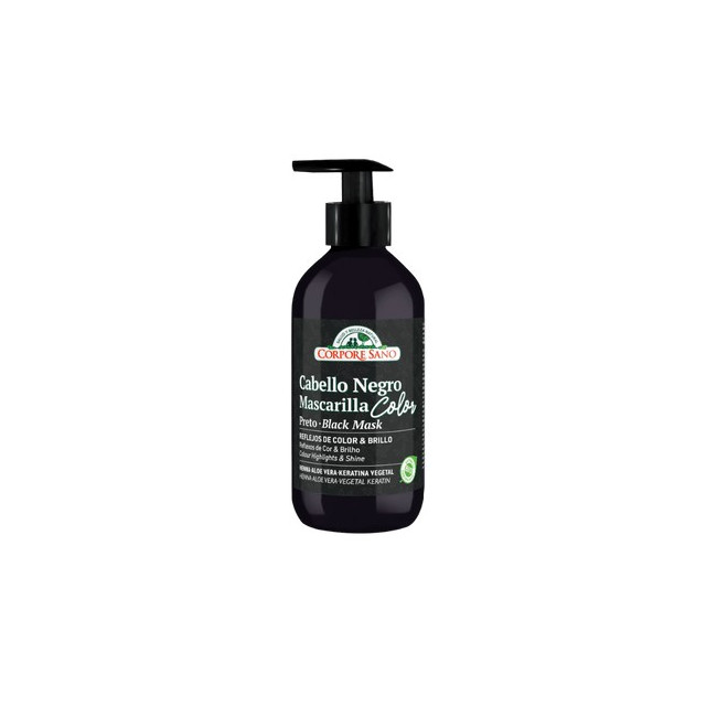 Mascarilla Color Cabello Negro HENNA, ALOE VERA, ACEITE DE JOJOBA, GIRASOL, KERATINA VEGETAL Mascarilla capilar que intensifica el color negro del cabello natural o teñido. Su fórmula con Henna, Aloe Vera y Aceite de Jojoba hidrata y nutre en profundidad, aportando brillo, suavidad y reflejos oscuros luminosos sin dañar la fibra capilar.