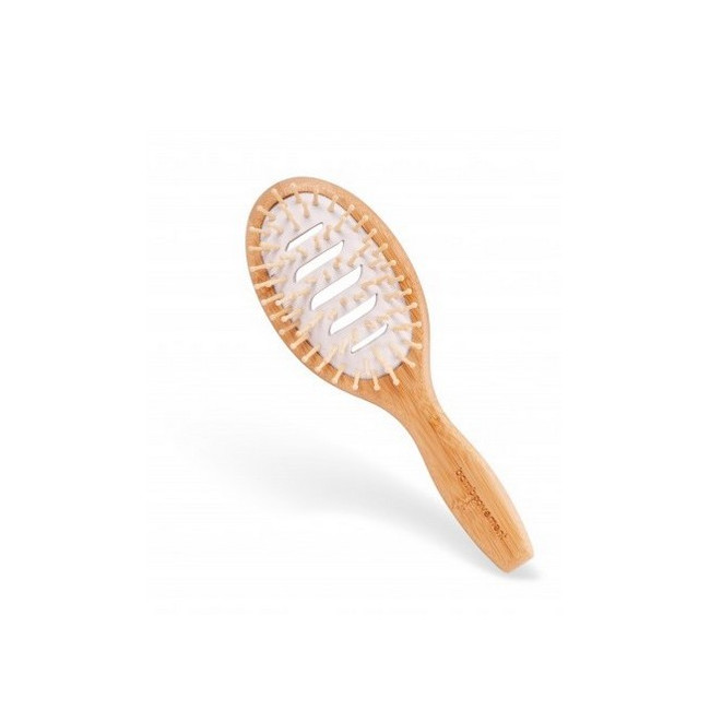 Este cepillo con látex natural y bambú certificado FSC tiene unas rejillas que proporcionan ventilación y ayudan a un secado rápido, ideal para cuando se usa secador. Con propiedades antiestáticas.