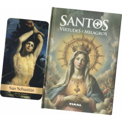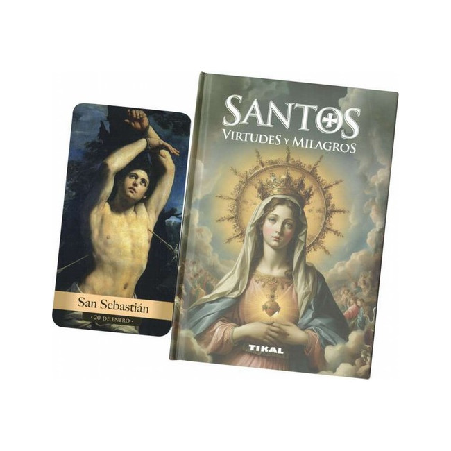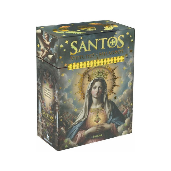 Caja que contiene 40 estampas de santos del cristianismo, representados en hermosas obras pictóricas, además de un libro de 80 páginas que muestra su vida y ejemplo, qué santo se festeja cada uno de los 365 días del años y un capítulo especial dedicado al culto a la Virgen María.