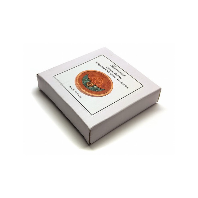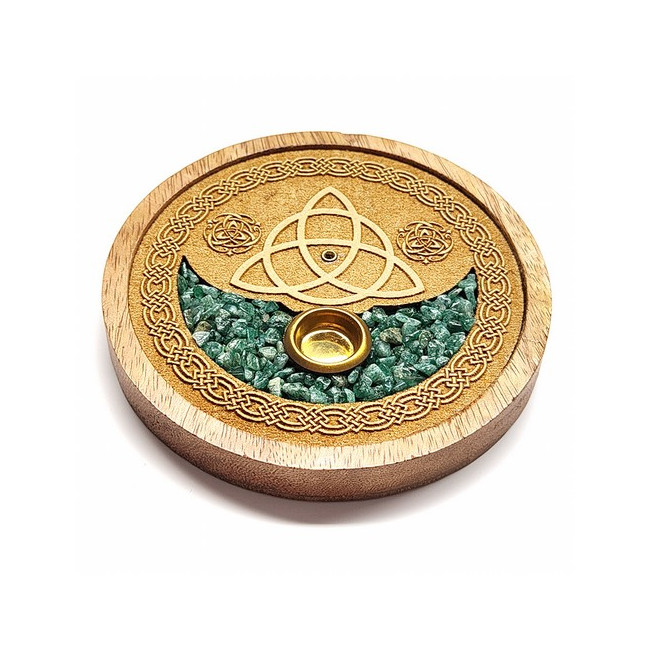 Quemador de incienso para varilla y cono. Forma redonda, realizado en madera natural y Aventurina, grabado con el simbolo de la Triqueta.