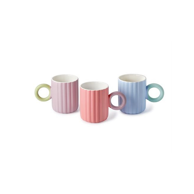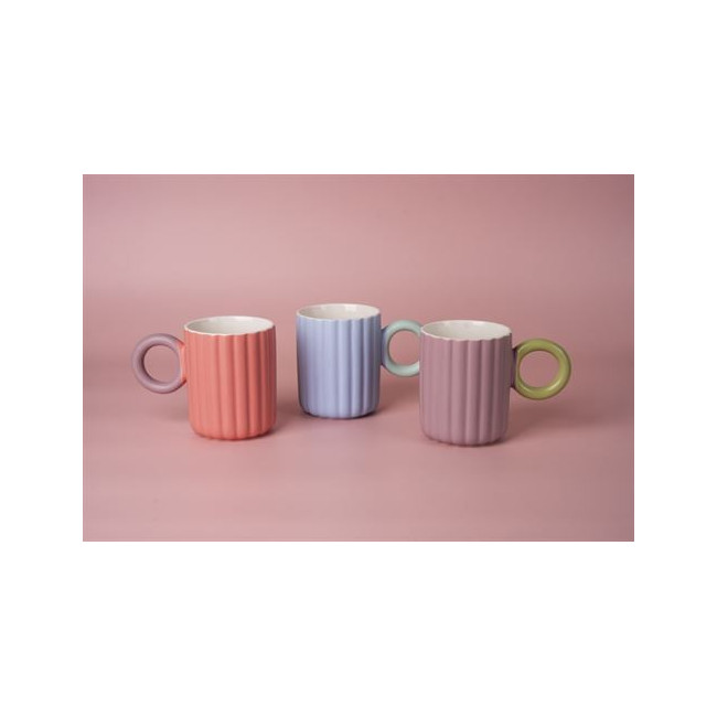 ¡Felicidad! ¡Su nombre lo dice todo! Porque esta hermosa taza nos trae alegría. ¿A ti también? Su vibrante combinación de colores en un atrevido estilo color block despierta alegría, risas y desenfado. La atrevida combinación de colores pastel contrastantes crea un look salvaje y original. Y así, la taza se convierte en una aventura viviente en la mesa de la cocina. Porque una cosa está clara: la vida es tan colorida como te atreves a imaginarla. Y con esta hermosa taza, hemos rebuscado en el cubo de pintura. Verde, morado, azul y rosa: ¡más variedad imposible! Complementada por la emocionante textura de la superficie, que consiste en un hermoso relieve rayado, la singularidad absoluta de esta taza continúa. El look se completa con un moderno asa redonda, que le da un toque extravagante. ¡Alegre, colorida y genial! Con una capacidad media de 0,35 l, esta hermosa taza también ofrece suficiente espacio para ideas creativas. Ya sea una mezcla de té dulce y afrutada o una moderna creación de café, ¡disfruta de lo que te apetezca!