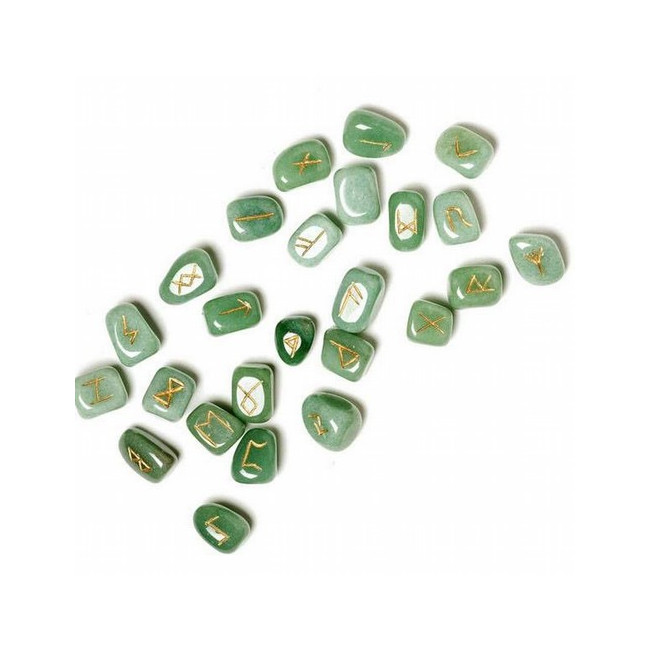 24 rodados de aventurina verde con los símbolos de las runas grabados en dorado.