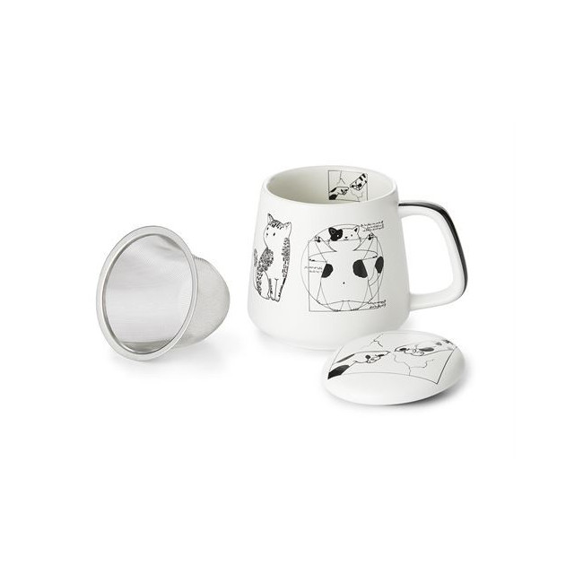 Ser un artista famoso, ¡solo por una vez! Eso es lo que pensaron estos creativos gatitos, y ahora brillan con el estilo de pintores y escultores de fama mundial. ¿Los reconoces? Porque aquí, cada taza de té de hierbas es una obra de arte que combina con encanto estilos artísticos clásicos con divertidas figuras felinas. Ideal para amantes del arte, amantes de los gatos o como un regalo original. El sutil diseño en blanco y negro, con su delicado trazo, se mantiene deliberadamente en segundo plano gracias a su óptica nítida, dejando que los pequeños detalles del diseño destaquen. La taza de té de hierbas sorprende con su novedosa forma que ofrece variedad visual para tu colección. Con una capacidad de 0,4 l, es ideal para disfrutar de diversas especialidades de té. El juego de 3 piezas, compuesto por taza, tapa y colador de acero inoxidable, es ideal para una persona y para preparar té directamente en la taza sin complicaciones.