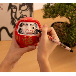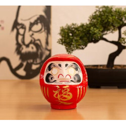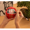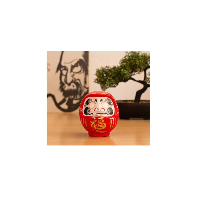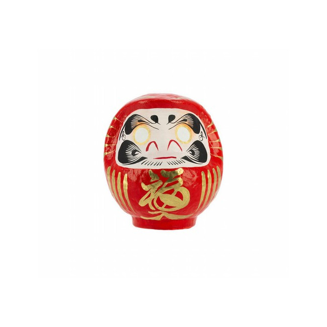 Daruma, Daruma: hago un propósito y te pinto un ojo. Cuando lo haya cumplido, te pintaré el otro. Siguiendo la tradición, las cejas de este Daruma tienen forma de grulla y las barbas se asemejan a las escamas del caparazón de una tortuga. Ambos animales son símbolos de longevidad en Japón. Además del kanji de buena suerte en el mentón lleva otros en cada lado de la cabeza. Expresan el deseo de bienestar, paz y prosperidad en el hogar. El Daruma rojo es el más popular en Japón. Se puede utilizar para todo tipo de objetivos. ¿Qué es un Daruma? Daruma es el Muñeco de los Propósitos, un amuleto japonés de la buena suerte. Hecho con papel maché, es una representación del monje Bodhidharma, fundador del budismo zen. Dice la leyenda que este alcanzó la iluminación después de meditar en una cueva durante 9 años pero que se le cayeron los brazos y piernas por atrofia. De allí la forma peculiar de Daruma. Cómo utilizar un Daruma Elegimos un propósito y le pintamos un ojo a Daruma. Cuando lo consigamos, le pintaremos el otro ojo en señal de gratitud. A modo de aprendizaje, apuntaremos la manera cómo hemos logrado nuestro objetivo, sintiendo en ese momento una gran satisfacción personal. Sobre el espíritu de Daruma Su figura nos sirve para recordar que, con determinación y perseverancia, conseguiremos el propósito que nos hayamos marcado. En este sentido, es muy importante que escojamos un objetivo específico y que sea alcanzable. No se trata de comprar un Daruma para luego esperar a que se cumpla nuestro deseo por arte de magia: Daruma nos motiva para trabajar duro y esforzarnos. Para los japoneses, cualquier ocasión es buena para regalar un Daruma; eso sí, hay fechas muy simbólicas como los cumpleaños y el Año Nuevo. Quema de Darumas En Japón, el Daruma dura un año -se haya conseguido el objetivo o no- y cada 18 de enero se queman miles de figuritas usadas en los templos. Allí donde estés, aprovecha tu fiesta favorita, Navidad, San Juan... para realizar este ritual. Después podrás elegir otros Darumas para tus nuevas metas. Detalles del producto Características:12 cm, papel maché Color principal:Rojo Made in:Japón