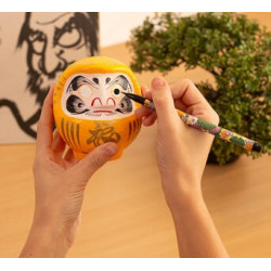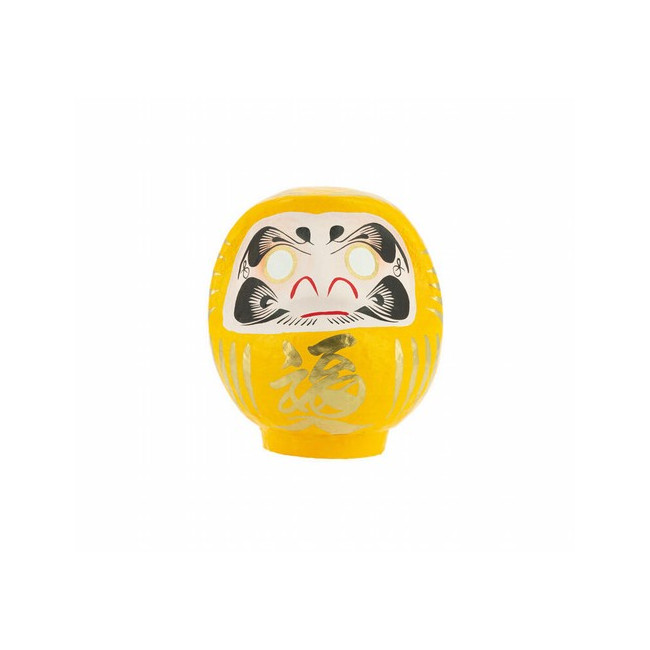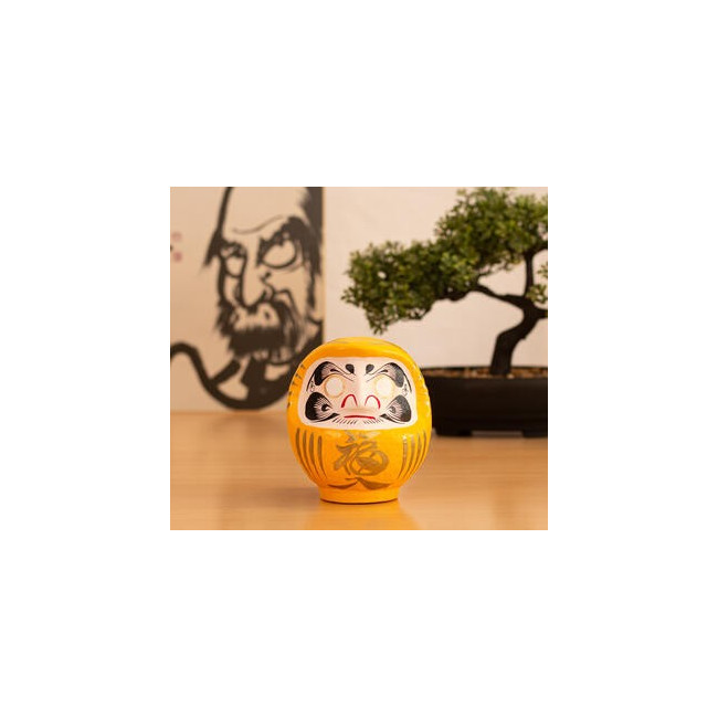 Siguiendo la tradición, las cejas de este Daruma tienen forma de grulla y las barbas se asemejan a las escamas del caparazón de una tortuga. Ambos animales son símbolos de longevidad en Japón. Además del kanji de buena suerte en el mentón lleva otros en cada lado de la cabeza. Expresan el deseo de bienestar, paz y prosperidad en el hogar. Uno recurre al Daruma amarillo para conseguir prosperidad en las finanzas. También se puede utilizar para trabajar temas de seguridad y protección.