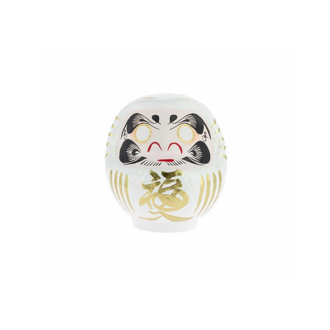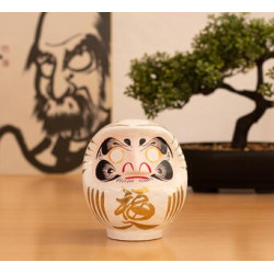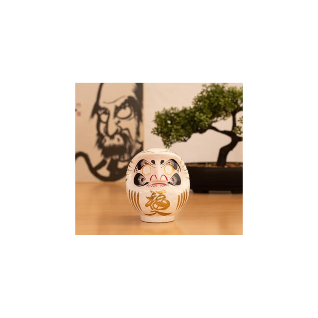 Daruma, Daruma: hago un propósito y te pinto un ojo. Cuando lo haya cumplido, te pintaré el otro. Siguiendo la tradición, las cejas de este Daruma tienen forma de grulla y las barbas se asemejan a las escamas del caparazón de una tortuga. Ambos animales son símbolos de longevidad en Japón. Además del kanji de buena suerte en el mentón lleva otros en cada lado de la cabeza. Expresan el deseo de bienestar, paz y prosperidad en el hogar. El Daruma blanco se utiliza para objetivos relacionados con el amor: se regala a menudo en las bodas en Japón. Es muy popular también entre los estudiantes japoneses que se preparan para los exámenes, al igual que el daruma azul. ¿Qué es un Daruma? Daruma es el Muñeco de los Propósitos, un amuleto japonés de la buena suerte. Hecho con papel maché, es una representación del monje Bodhidharma, fundador del budismo zen. Dice la leyenda que este alcanzó la iluminación después de meditar en una cueva durante 9 años pero que se le cayeron los brazos y piernas por atrofia. De allí la forma peculiar de Daruma. Cómo utilizar un Daruma Elegimos un propósito y le pintamos un ojo a Daruma. Cuando lo consigamos, le pintaremos el otro ojo en señal de gratitud. A modo de aprendizaje, apuntaremos la manera cómo hemos logrado nuestro objetivo, sintiendo en ese momento una gran satisfacción personal. Sobre el espíritu de Daruma Su figura nos sirve para recordar que, con determinación y perseverancia, conseguiremos el propósito que nos hayamos marcado. En este sentido, es muy importante que escojamos un objetivo específico y que sea alcanzable. No se trata de comprar un Daruma para luego esperar a que se cumpla nuestro deseo por arte de magia: Daruma nos motiva para trabajar duro y esforzarnos. Para los japoneses, cualquier ocasión es buena para regalar un Daruma; eso sí, hay fechas muy simbólicas como los cumpleaños y el Año Nuevo. Quema de Darumas En Japón, el Daruma dura un año -se haya conseguido el objetivo o no- y cada 18 de enero se queman miles de figuritas usadas en los templos. Allí donde estés, aprovecha tu fiesta favorita, Navidad, San Juan... para realizar este ritual. Después podrás elegir otros Darumas para tus nuevas metas. Detalles del producto Características:12 cm, papel maché Color principal:Blanco Made in:Japón