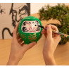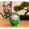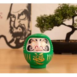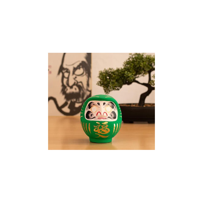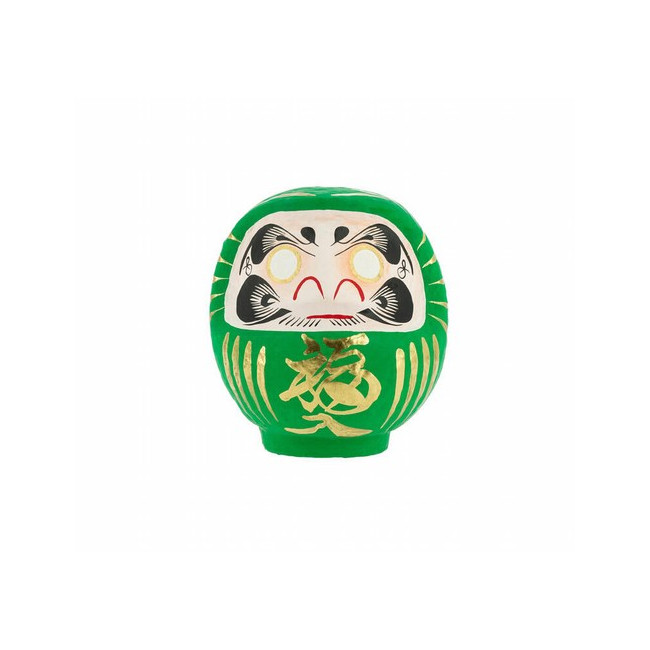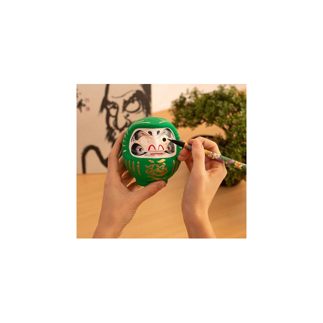 Daruma, Daruma: hago un propósito y te pinto un ojo. Cuando lo haya cumplido, te pintaré el otro. Siguiendo la tradición, las cejas de este Daruma tienen forma de grulla y las barbas se asemejan a las escamas del caparazón de una tortuga. Ambos animales son símbolos de longevidad en Japón. Además del kanji de buena suerte en el mentón lleva otros en cada lado de la cabeza. Expresan el deseo de bienestar, paz y prosperidad en el hogar. El Daruma verde se utiliza para objetivos relacionados con la salud y la forma física. ¿Qué es un Daruma Daruma es el Muñeco de los Propósitos, un amuleto japonés de la buena suerte. Hecho con papel maché, es una representación del monje Bodhidharma, fundador del budismo zen. Dice la leyenda que este alcanzó la iluminación después de meditar en una cueva durante 9 años pero que se le cayeron los brazos y piernas por atrofia. De allí la forma peculiar de Daruma. Cómo utilizar un Daruma Elegimos un propósito y le pintamos un ojo a Daruma. Cuando lo consigamos, le pintaremos el otro ojo en señal de gratitud. A modo de aprendizaje, apuntaremos la manera cómo hemos logrado nuestro objetivo, sintiendo en ese momento una gran satisfacción personal. Sobre el espíritu de Daruma Su figura nos sirve para recordar que, con determinación y perseverancia, conseguiremos el propósito que nos hayamos marcado. En este sentido, es muy importante que escojamos un objetivo específico y que sea alcanzable. No se trata de comprar un Daruma para luego esperar a que se cumpla nuestro deseo por arte de magia: Daruma nos motiva para trabajar duro y esforzarnos. Para los japoneses, cualquier ocasión es buena para regalar un Daruma; eso sí, hay fechas muy simbólicas como los cumpleaños y el Año Nuevo. Quema de Darumas En Japón, el Daruma dura un año -se haya conseguido el objetivo o no- y cada 18 de enero se queman miles de figuritas usadas en los templos. Allí donde estés, aprovecha tu fiesta favorita, Navidad, San Juan... para realizar este ritual. Después podrás elegir otros Darumas para tus nuevas metas. Detalles del producto Características:12 cm, papel maché Color principal:Verde Made in:Japón