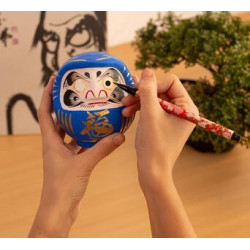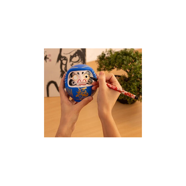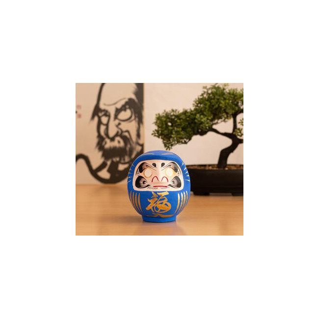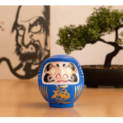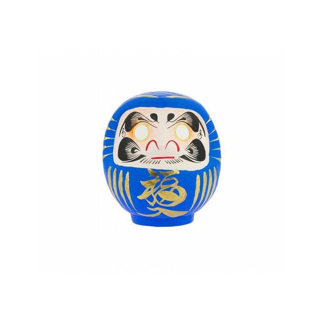 Siguiendo la tradición, las cejas de este Daruma tienen forma de grulla y las barbas se asemejan a las escamas del caparazón de una tortuga. Ambos animales son símbolos de longevidad en Japón. Además del kanji de buena suerte en el mentón lleva otros en cada lado de la cabeza. Expresan el deseo de bienestar, paz y prosperidad en el hogar. En Japón los estudiantes de todas las edades recurren al Daruma azul con la finalidad de tener éxito en sus exámenes. También se puede utilizar para todo tipo de retos personales.