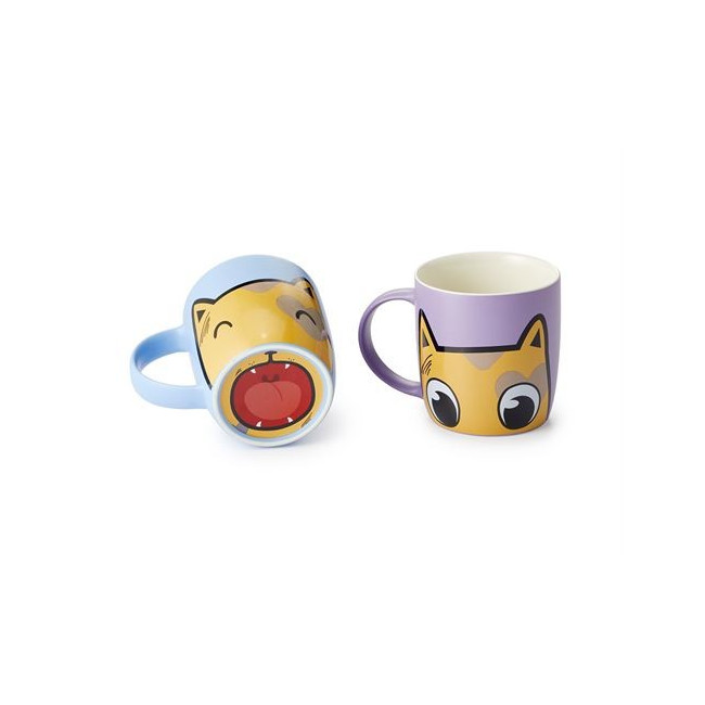 ¡Guau, miau! Nuestro adorable gato "Murphy" es un tipo muy gracioso y siempre tiene una sorpresa preparada. Por eso, en esta preciosa taza de porcelana fina, solo revela su verdadera cara al mirarla dos veces. Esto se debe a que solo te darás cuenta de si "Murphy" está de buen humor o irritable al levantar la taza de la mesa. Y así es como funciona: la parte inferior de la taza muestra un hocico tierno y amigable o unos incisivos brillantes. Otro dato curioso: al beber de la taza, casi parece que la boca de "Murphy" se fusiona con tu cara. Así que tienes dos opciones: saludar a tus seres queridos con una sonrisa radiante y empezar el día relajado, o, si eres de los que se levantan de mal humor por la mañana, enviar un mensaje claro a quienes te rodean con esa cara de enfado: ¡por favor, no me hablen! En cualquier caso, el elegante diseño en azul y morado, así como las simpáticas ilustraciones del gato, seguro que harán sonreír a grandes y pequeños. Este innovador producto, desarrollado internamente y especialmente para nuestra gama ChaCult®, aporta un toque de frescura a cualquier colección de tazas. Con una capacidad media de 0,35 l, es ideal para disfrutar de diversas bebidas calientes.