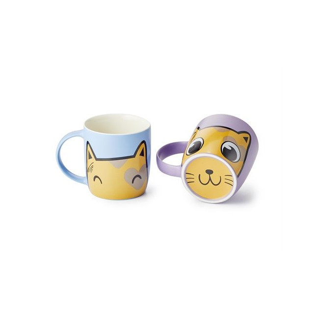 ¡Guau, miau! Nuestro adorable gato "Murphy" es un tipo muy gracioso y siempre tiene una sorpresa preparada. Por eso, en esta preciosa taza de porcelana fina, solo revela su verdadera cara al mirarla dos veces. Esto se debe a que solo te darás cuenta de si "Murphy" está de buen humor o irritable al levantar la taza de la mesa. Y así es como funciona: la parte inferior de la taza muestra un hocico tierno y amigable o unos incisivos brillantes. Otro dato curioso: al beber de la taza, casi parece que la boca de "Murphy" se fusiona con tu cara. Así que tienes dos opciones: saludar a tus seres queridos con una sonrisa radiante y empezar el día relajado, o, si eres de los que se levantan de mal humor por la mañana, enviar un mensaje claro a quienes te rodean con esa cara de enfado: ¡por favor, no me hablen! En cualquier caso, el elegante diseño en azul y morado, así como las simpáticas ilustraciones del gato, seguro que harán sonreír a grandes y pequeños. Este innovador producto, desarrollado internamente y especialmente para nuestra gama ChaCult®, aporta un toque de frescura a cualquier colección de tazas. Con una capacidad media de 0,35 l, es ideal para disfrutar de diversas bebidas calientes.