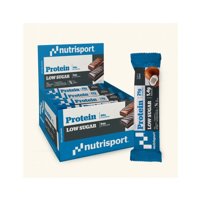La barrita Protein Low Sugar sabor Coco es una barrita de 60g con un alto contenido en proteína (21g) y muy poca azúcar (1,4g).